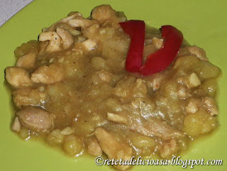 Carnea de pui dezosata si fara piele, o tai cubulete si o pui intr-o tigaie incapatoare impreuna cu apa si uleiul. Presari putina sare si pui o foaie de dafin.